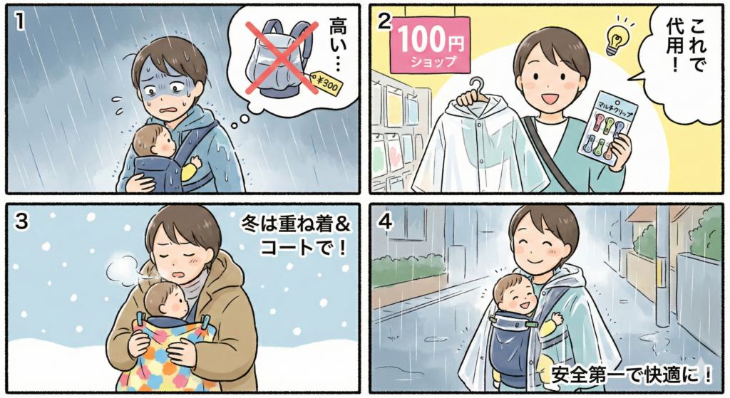 - 抱っこ紐の雨の日用カバーや防寒ケープを代用するメリット