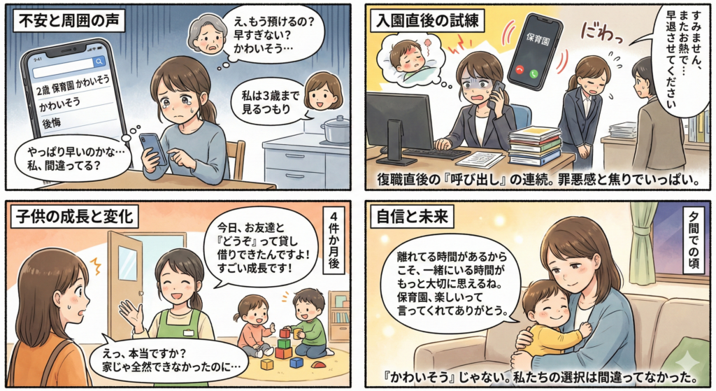 結論として、2歳から保育園に預けることは「かわいそう」なことでも、「後悔」すべきことでもありません。大切なのは、親がその選択に自信を持ち、園との信頼関係を築きながら、限られた時間の中で最大限の愛情を伝えることです。