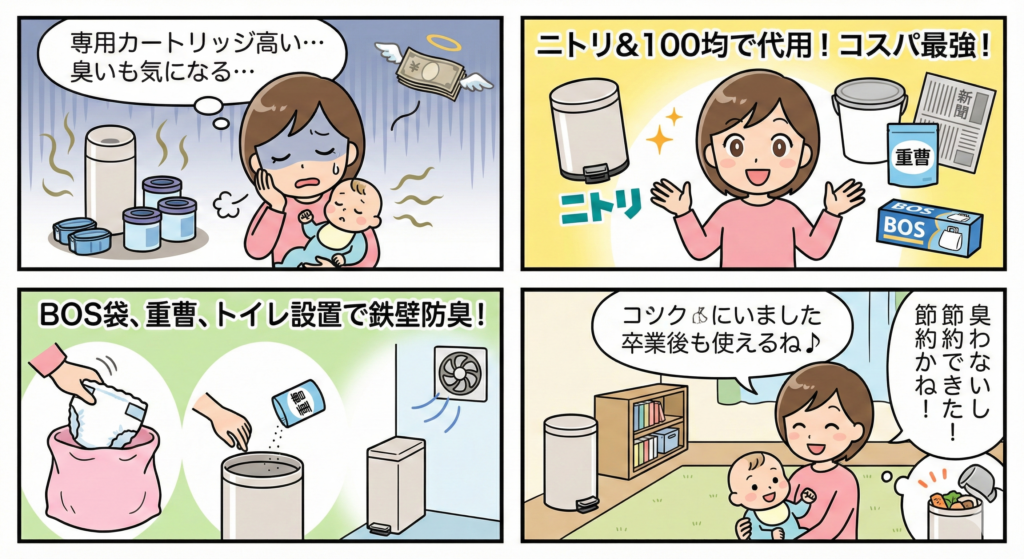 毎日の育児、本当にお疲れ様です。赤ちゃんとの生活は幸せいっぱいですが、避けて通れないのがおむつの処理問題ですよね。特に気になるのが、部屋に漂う独特の臭いと、専用のおむつポットにかかる意外と馬鹿にならない費用ではないでしょうか。市販の専用品は高性能ですが、専用カートリッジを買い続けるランニングコストを考えると、もっと賢く節約したいと感じるのが本音ですよね。