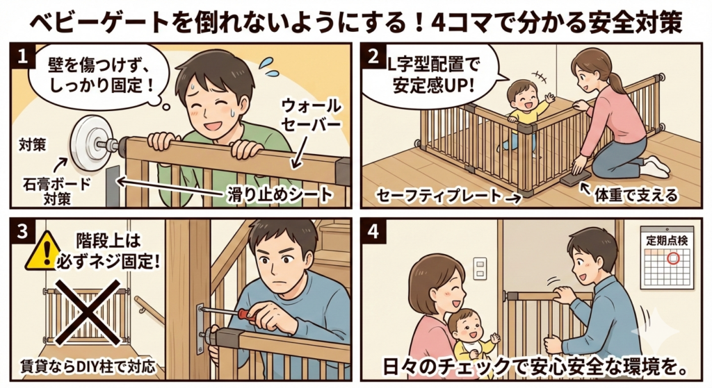 事故を未然に防ぎベビーゲートを倒れないようにする方法