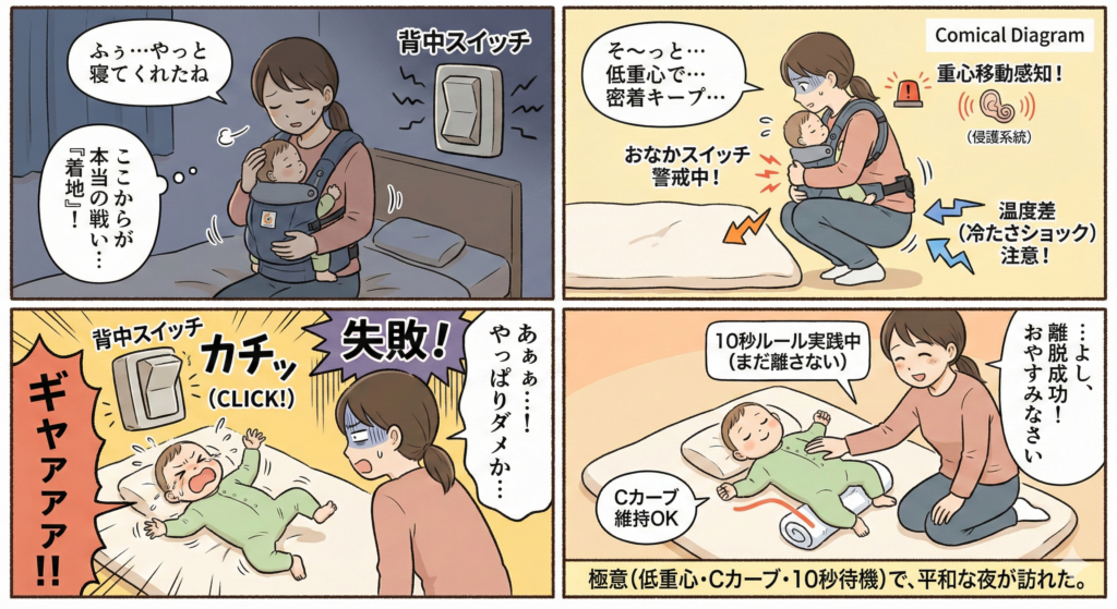 この心拍変動は、実は背中が布団に触れる数秒前から始まっています。つまり、抱っこ紐を緩める動作そのものが、すでにスイッチを入れる予兆となっているのです。動作はどこまでも静かに、そして密着を解くのは最後、という意識が成功率を左右します。