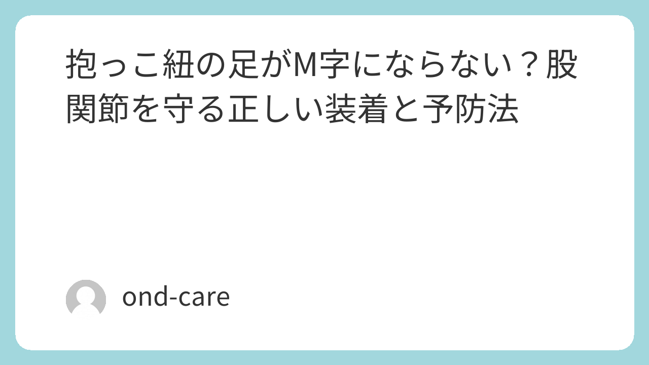 日本の赤ちゃんは、欧米に比べて「股関節脱臼」を起こしやすい傾向があると言われています。抱っこ紐を使用する際もおろした後も、常に「M字開脚(コアラのポーズ)」を守ることが絶対条件です。