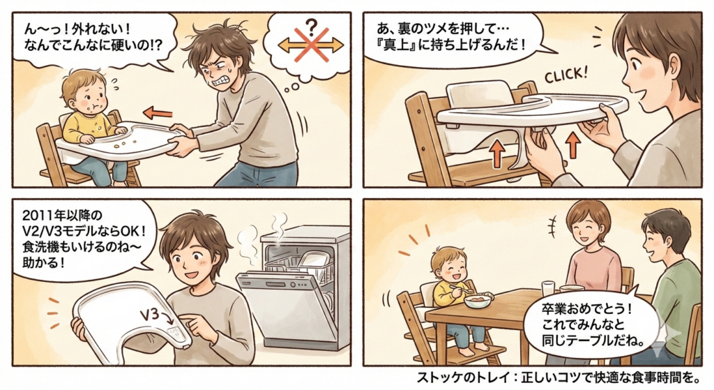 今回は、ストッケのトレイやベビーセットのハイチェアでの外し方を中心に、基本構造から裏技的なコツ、メンテナンスの注意点、そして卒業後のステップまで、網羅的に詳しくお届けしてきました。トレイが外れなくて苦戦していた方も、この記事で紹介した「裏のツメを指の腹で捉えること」と「真上へ垂直に最短距離で引き抜くこと」の2点を実践すれば、明日からは力を入れることなく、スッと外せるようになるはずです。